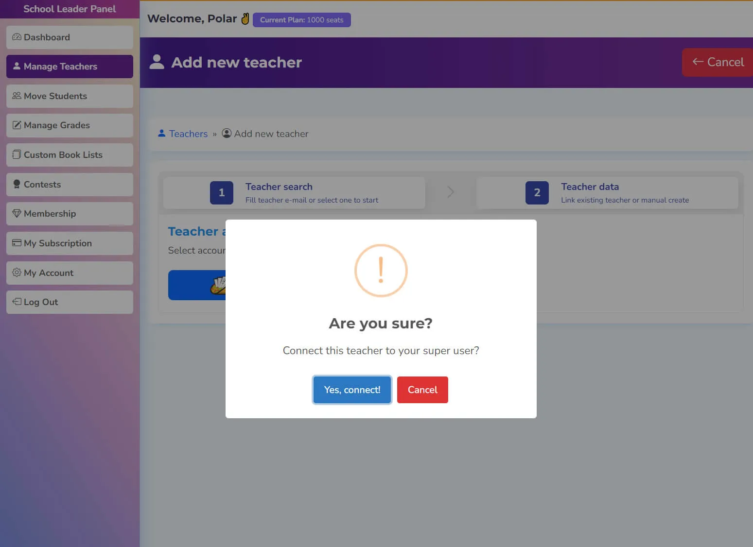 Super users can search for teachers on the platform or invite them to join their team. By inviting a teacher to join, the super user gains supervision over the teacher and their students.